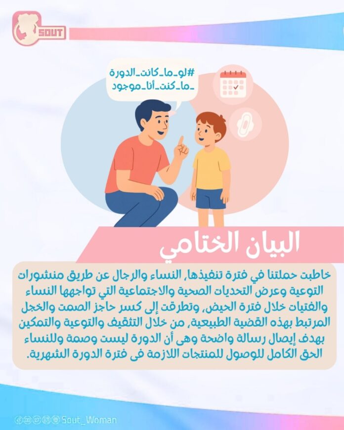 بالتزامن مع حملة مبادرة “صوت لدعم حقوق المرأة” التي أطلقتها تحت شعار ” لو ما كانت الدورة ما كنت أنا موجود” في اليوم العالمي للنظافة الصحية للدورة الشهرية بهدف تعزيز الوعي المجتمعي حول أهمية النظافة الشخصية خلال الدورة الشهرية ومكافحة الوصم الاجتماعي المرتبط بها، ننشر البيان الختامي للحملة مع استعراض نتائجها وما ركزنا عليه خلال الأيام السابقة.