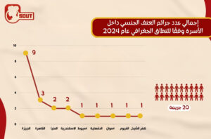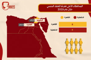 حيث سجلت أعلى نسبة في محافظة الجيزة بحوالي 9 جرائم عنف جنسي، وتليها محافظة القاهرة بواقع 3 حالات، ثم المنيا والإسكندرية بإجمالي حالتين لكًلا منهما، وأخيرًا تساوت الحالات بواقع حالة واحدة لكًلا من محافظة أسيوط والدقهلية وأسوان والفيوم وكفر الشيخ.